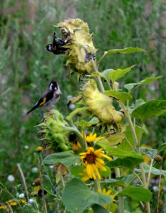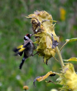 Zwar werden im Lied Amsel, Drossel, Fink und Star besungen, aber bei uns tummeln sich nur die Finken im Garten. Im letzten Blogbeitrag hatte ich ja schon vom Grünfink an der Sonnenblume berichtet und jetzt haben wir seit einigen Tagen ein Stieglitzpärchen immer wieder auf Besuch an den Sonnenblumen, aber auch an der Bienen- und Schmetterlingsweide. Die Steiglitze, auch als Distelfinken bekannt, sind vom Naturschutzbund Deutschland zum „Vogel des Jahres 2016“ gewählt worden. Wir haben also hohen Besuch im Garten 😉